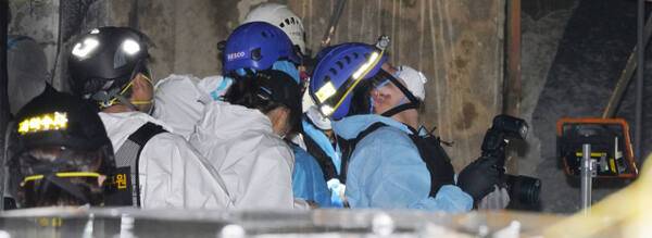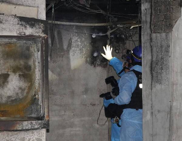 경찰, 소방, 국립과학수사연구원 등 관계자들이 18일 광명시 소하동 아파트 화재현장에서 합동감식을 하고 있다.
