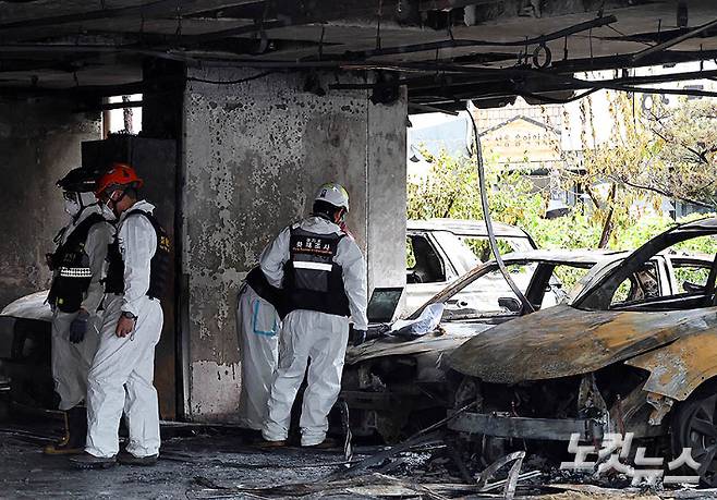 지난 17일 밤 10층짜리 아파트 1층 필로티 주차장에서 발생한 화재로 다수의 인명피해가 발생한 경기도 광명시 소하동 한 아파트에서 18일 오전 경찰과 소방, 국과수 등 관계자들이 합동 감식을 하고 있다.