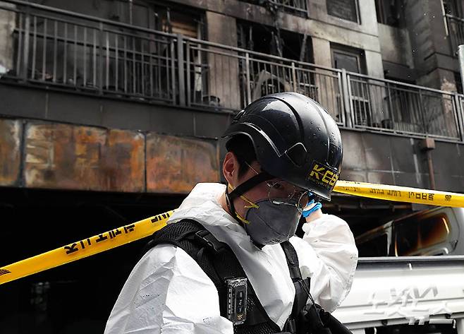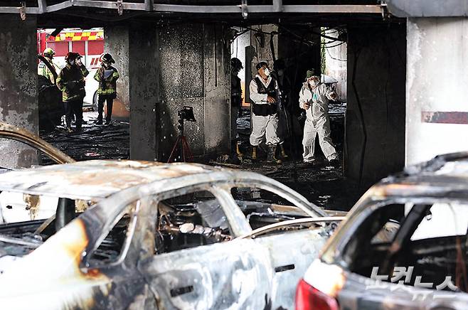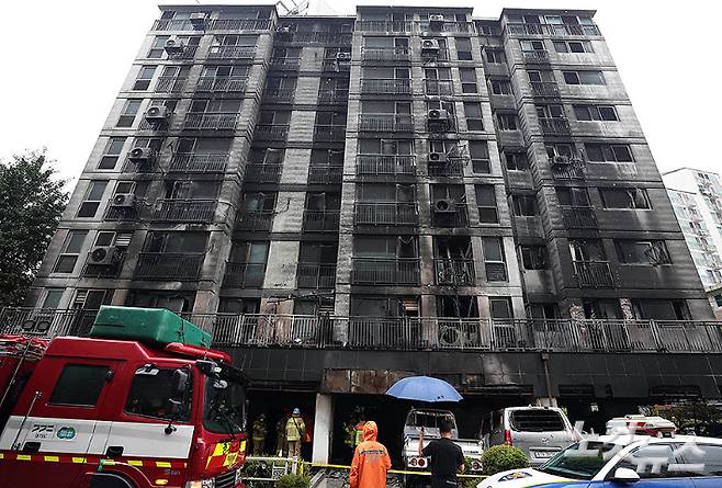 지난 17일 밤 10층짜리 아파트 1층 필로티 주차장에서 발생한 화재로 다수의 인명피해가 발생한 경기도 광명시 소하동 한 아파트에서 18일 오전 경찰과 소방, 국과수 등 관계자들이 합동 감식을 하고 있다. 이번 화재로 인한 인명피해는 사망 3명, 중상 23명, 경상 40명 등 모두 65명이다.