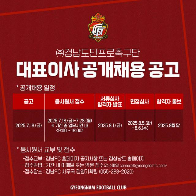 공개채용은 자격조건을 심사하는 1차 서류심사와 직무수행에 필요한 능력과 적격성 등을 종합적으로 심사하는 2차 면접심사로 진행되며, 최종적으로 경남FC 이사회에서 대표이사를 선임할 계획이다.