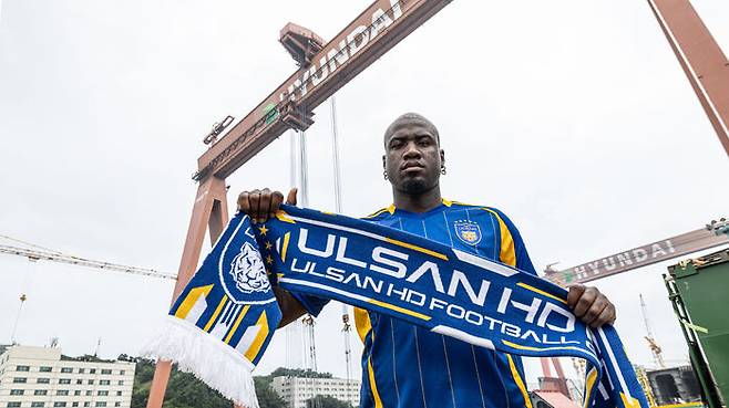 울산은 모기업 HD의 1,600톤급 초대형 골리앗 크레인을 배경으로 말컹 영입 '오피셜 사진'을 찍었습니다.