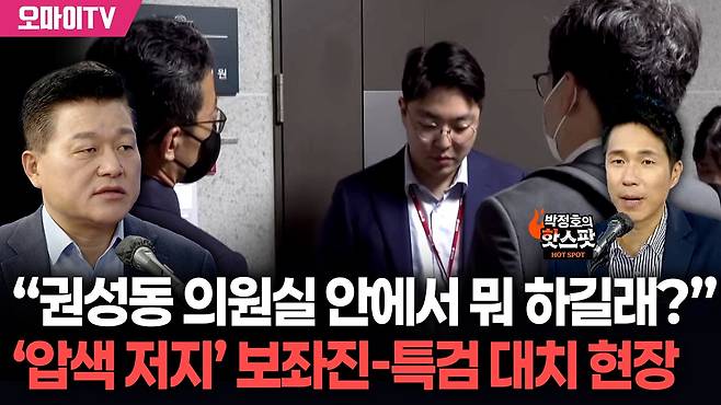◎ 박정호 > 그래요. 자 국민의힘 지금 또 위기로 가고 있다. 윤어게인이다라는 말씀을 드리고요. 자 지금 현장. 권성동 의원 앞에서 권성동 의원 보좌진과 특검. 어떻게 보면 대치를 하고 있는데요. 대치하고 있는 상황을 좀 정리해드리면 변호인이 오면 그때 영장보고 들어가자라는 게 권성동 의원 쪽의 주장이고 특검 얘기는 뭐냐면 아 우리 압수수색 착수 안 할 테니까 기자들 여기 많으니까 안에서 좀 기다리자라고 했는데 보좌진은 변호인이랑 입회하자 이렇게 막아서고 있어요. 대치 중이고.