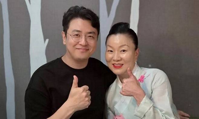 청바지에 검정 반팔티를 입은 그는 곱게 한복을 차려입은 김 셰프와 나란히 앉아 '엄지척' 포즈를 취하며 훈훈한 분위기를 자아냈다.