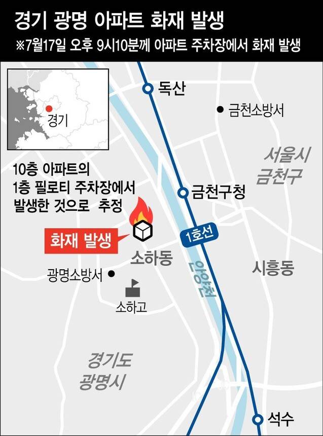 18일 소방청과 광명경찰서 등의 설명을 종합하면, 전날 밤 9시10분께 경기도 광명시 소하동 오크팰리스 아파트 1층 필로티 주차장에서 발생한 화재로 사망 3명, 중상 20명, 경상 42명 등 모두 65명이 숨지거나 다쳤다. 사망자 3명은 화재 당시 심정지 상태로 병원에 옮겨졌으나 끝내 숨졌다. 중상자 중 일부도 생명이 위태로운 것으로 알려져, 앞으로 사망자는 더 나올 수 있다.