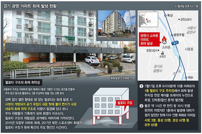 사망자 3명을 포함해 사상자 65명을 낸 경기도 광명시 소하동 아파트 화재를 두고 불에 취약한 1층 필로티 구조가 인명 피해를 키웠다는 지적이 나온다.