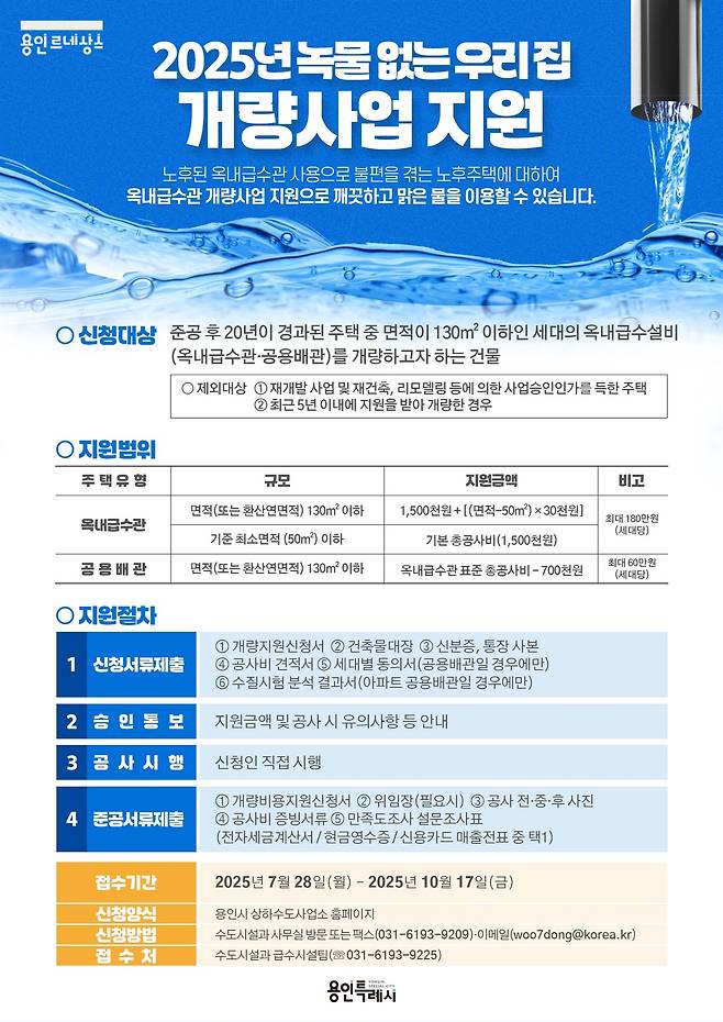 | ▲ 경기 용인시는 ‘녹물 없는 우리 집 수도관 개량사업’ 참여 가구를 추가로 모집한다고 18일 밝혔다. |