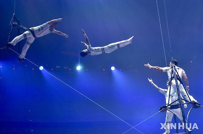 [모스크바=신화/뉴시스] 17일(현지 시간) 러시아 모스크바에서 열린 세계 서커스 예술제 '아이돌-2025'에서 참가자들이 묘기를 선보이고 있다. 이 축제는 17일부터 20일까지 열린다. 2025.07.18.