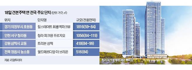 이달 하순 수도권에서는 대규모 단지 공급이 이어진다. 경기 의정부시 호원동 ‘힐스테이트 회룡역파크뷰’(1816가구), 인천 서구 청라동 ‘청라 피크원 푸르지오’(1056실) 등은 이날 견본주택을 열고 분양 일정에 들어간다. 힐스테이트 회룡역파크뷰는 674가구(전용 59·84㎡)가 일반분양 물량으로 나온다. 오는 21일 특별공급을 시작으로 22일 1순위, 23일 2순위 청약을 진행한다. 계약금을 5%로 낮췄고, 1차 계약금은 500만원 정액제를 적용했다. 중도금 60% 무이자 혜택도 제공한다. 지하철 1호선과 의정부경전철이 지나는 회룡역이 인접해 있다. 두 정거장이면 서울(도봉산역) 진입이 가능하다.