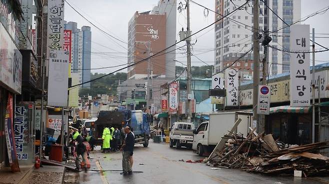 ▲ 18일 오전 집중호우로 침수된 충남 당진시 읍내동 당진전통시장에서 상인들이 비가 내리는 와중에도 복구작업에 한창이다.