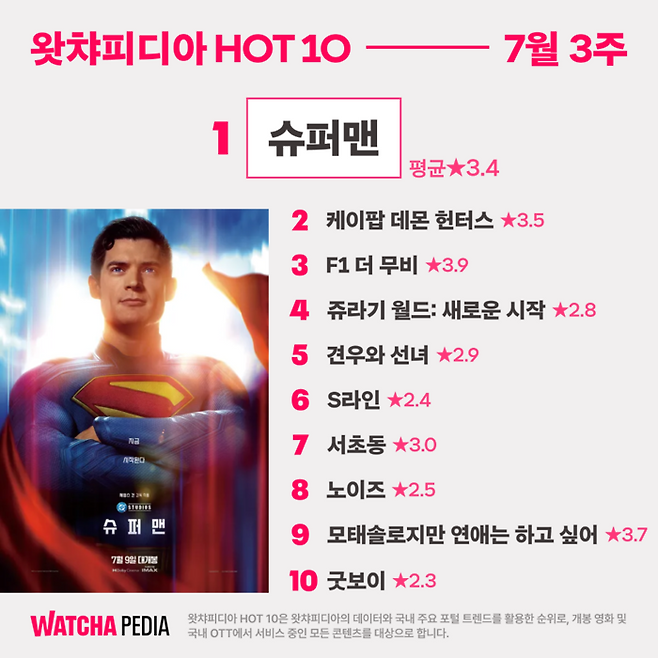 '슈퍼맨', 왓챠피디아 1위…'케이팝 데몬 헌터스'는 역주행 2위