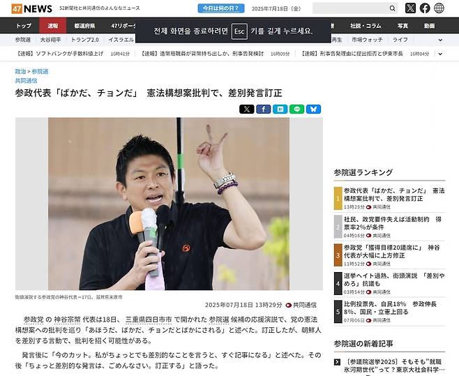 '일본인 퍼스트'를 내세운 일본 우익 야당 대표가 참의원(상원) 선거 유세에서 한국인을 멸시하는 용어를 썼다가 사과했다.