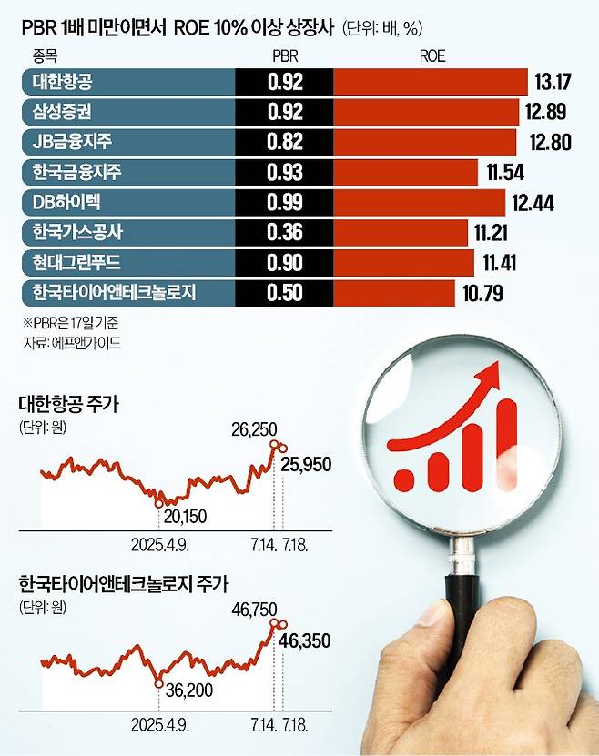 에프앤가이드에 따르면 유가증권시장에서 PBR이 1배 미만(17일 기준)이면서 올해 ROE가 10%를 넘은 기업은 대한항공 한국타이어 한국가스공사 DB하이텍 등이다. 대한항공의 PBR은 0.92배로, 유가증권시장 평균보다 낮지만 ROE는 13.17%에 달한다. 향후에도 안정적인 유가 수준과 아시아나항공 인수 마무리 등이 호재로 작용할 수 있다는 관측이 나온다. 증권가에선 이 회사 영업이익이 올해 2조396억원에서 2027년 2조5112억원으로 증가할 것으로 추정하고 있다.
