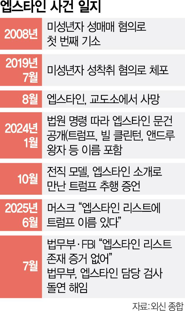 미국 정가에 폭풍을 불러온 억만장자 엡스타인은 미성년자 성착취 혐의로 체포된 뒤 2018년 교도소에서 스스로 생을 마감했다. 이후 그에게 정관계 유력 인사들이 포함된 성접대 리스트가 있다거나 사인이 타살이라는 음모론이 끊임없이 흘러나왔다. 최근 법무부와 FBI는 엡스타인이 유력 인사들을 협박하거나 블랙리스트가 있었다는 증거는 없으며 그의 사망 원인도 자살이라고 재확인한 조사 결과를 공개했지만 의혹은 수그러들지 않고 있다.