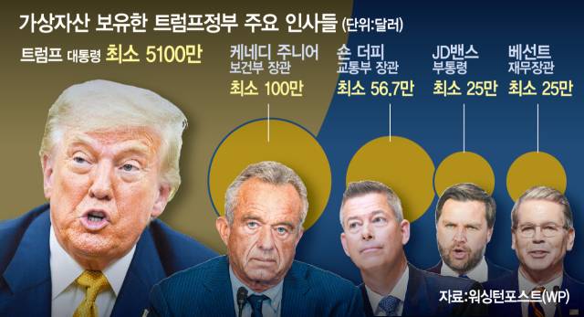 트럼프 행정부 고위직은 전체 최소 1억 9300만 달러(2684억 원)의 가상자산을 신고했다.