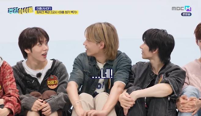 이날 크래비티 형준은 몬스타엑스 민혁이 '주간아' 처음 출연 당시 외친 "몬스타엑스의 약방의 감초가 되고 싶은 민혁입니다"를 따라 했다.