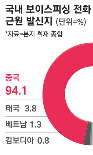 18일 경찰청 등 수사당국에 따르면 해외발 보이스피싱 전화의 94%가 중국에서 걸려오고 있는 것으로 파악됐다. 이어 태국 3.8%, 베트남 1.3% 등으로 집계됐다. 최근 보이스피싱 조직의 새로운 본거지로 주목받고 있는 캄보디아발 발신은 0.8%였다. 여전히 한국 보이스피싱 범죄의 최대 온상지 역할은 중국인 것이다.