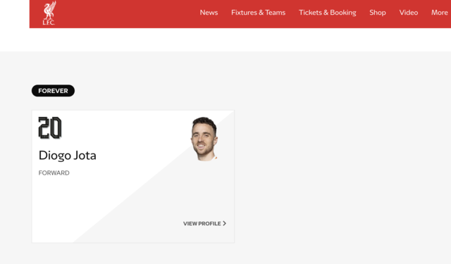 리버풀은 공식 홈페이지의 남자 A팀의 프로필에 조타를 삽입했다.