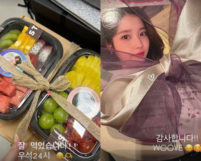 아이유는 지난 17일 개인 SNS에 "잘 먹었습니다! 우석24시", "고맙습니다! WOOVE"라며 사진들을 게재했다. 공개된 사진에는 아이유가 새 드라마 '21세기 대군부인' 촬영 현장에서 받은 간식 및 도시락 등을 인증한 모습이 담겼다.