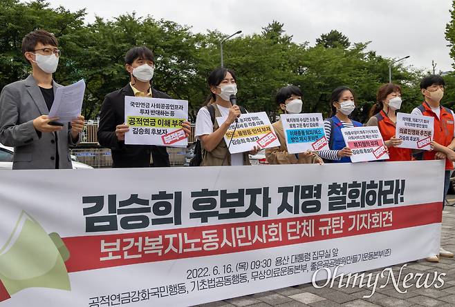 | ▲ 김승희 보건복지부장관 후보자 지명철회 촉구 보건복지노동시민사회 기자회견이 지난 2022년 6월16일 오전 서울 용산구 대통령실앞에서 열리고 있다. |
