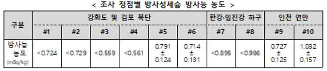 방사성 세슘은 10개 모든 정점에서 분석 장비의 최소검출가능농도(MDA) 미만이거나 최근 5년간 서해에서 측정한 수준 미만으로 조사됐다. 중금속은 모든 정점에서 ‘환경정책기본법’에 따른 환경기준과 ‘해양환경 보전 및 활용에 관한 법률'에 따른 해양환경기준에 적합하거나 검출한계 미만으로 확인됐다.