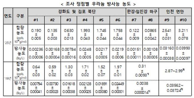 이번에 추가된 한강·임진강 하구 2개 정점(0.087∼0.122ppb)과 인천 연안 2개 정점(2.541∼3.211ppb)의 우라늄 농도도 2019년 비교정점 농도와 견줄 때 유의미한 차이가 확인되지 않았다.