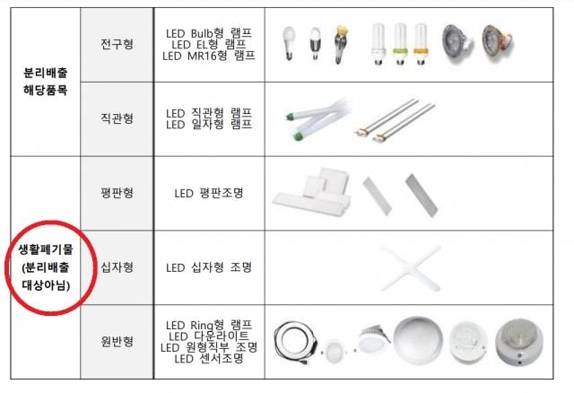 이 과정에서 LED 업계의 강한 반발 등에 따라 LED 조명 중 전구형과 직관형만 재활용 품목이 됐다. 정작 많이 쓰는 평판형 등은 제외됐다.