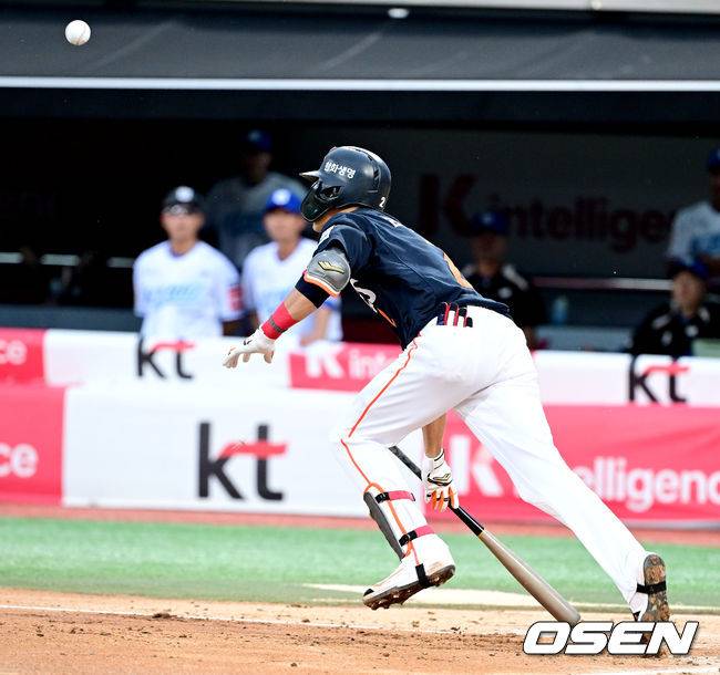 2회초 1사 1, 3루 상황 한화 심우준이 스퀴즈 번트를 대고 있다. 2025.07.18 / dreamer@osen.co.kr