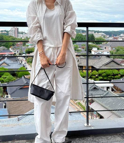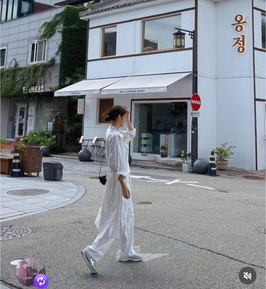 서하얀은 이날 오버핏 사이즈의 커다란 셔츠를 걸치고, 이너로 화이트 컬러의 민소매를 입었다. 또한 와이드 팬츠도 하얀 컬러를 골라서 그의 이름 그대로 하얗게 무심하게 꾸민 룩을 선보여 시선을 끌었다.