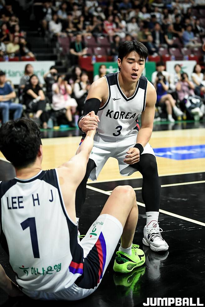 [점프볼=안양/유용우 기자] 18일 안양 정관장 아레나에서 열린 한국 남자농구 대표팀과 카타르 대표팀의 평가전, 한국 남자농구대표팀 정성우가 넘어진 이중현을 일으켜 세우고 있다.