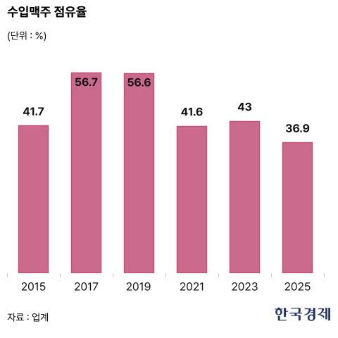 수입 맥주 시장은 2014년 편의점에서 ‘4캔 1만원’ 행사를 도입하며 본격 성장세에 진입했다. 하지만 2019년 노재팬으로 아사히, 기린, 삿포로 등 일본 브랜드들의 매출이 주춤했다. 이후 코로나19 시기를 거치면서 글로벌 브랜드들이 대거 국내에 진출했으며 4캔 행사 가격이 1만2000원으로 오르면서 국산 맥주와의 격차가 벌어졌다는 설명이다. 현재 수입 맥주는 국내 전체 맥주 시장에서 36.9%의 점유율을 차지하고 있다.