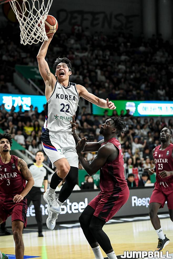 이현중(20점 10리바운드 5어시스트)과 여준석(16점 9리바운드 6어시스트)이 또 한번 맹활약했고, 이정현(13점 10어시스트 2스틸)과 유기상(17점 3점슛 4개 2리바운드)도 빛났다. 귀화선수 브랜든 굿윈과 주축 멤버 타일러 해리스가 빠진 카타르는 한국의 상대가 되지 못했다. 1쿼터부터 리드를 잡으며 대승을 거뒀다.