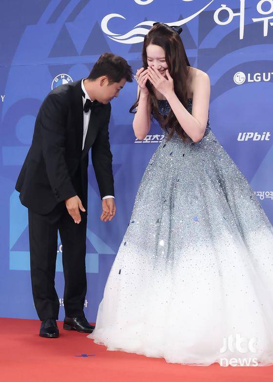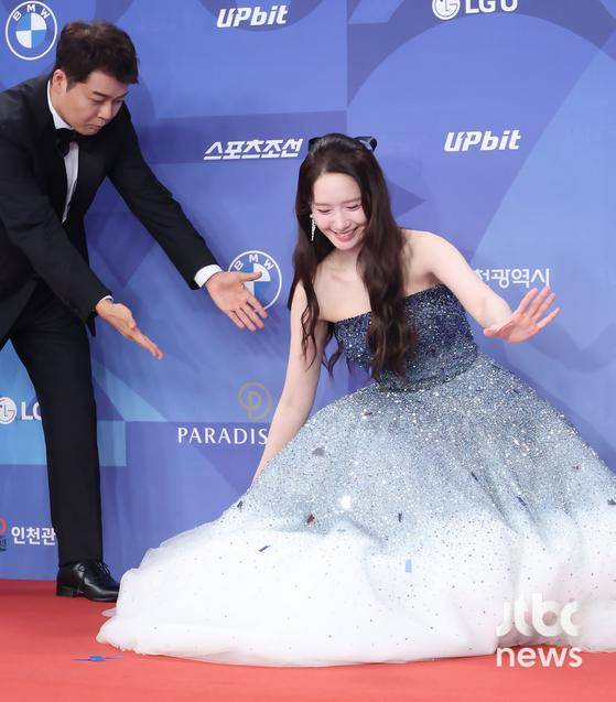 배우 윤아가 레드카펫에서 순간 중심을 잃고 주저앉는 해프닝을 겪었다.