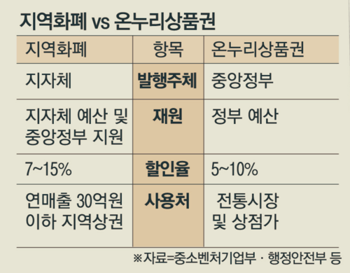 지역화폐는 각 지자체가 자체 예산으로 발행하고 정부가 할인율의 일부를 국비로 보전하는 구조다. 연매출 30억원 이하 상권에서 사용할 수 있는 등 소상공인 지원 수단이지만, 사용처가 지자체 내로 제한된다는 점에서 온누리상품권과는 다르다.