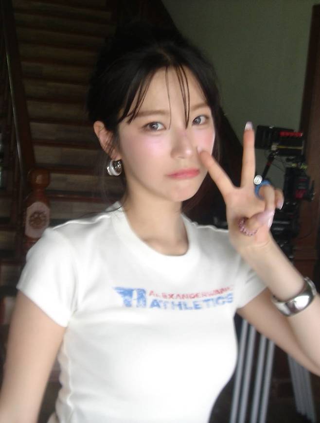 여유롭게 펼쳐진 두 팔은 자연스러움과 자유로운 느낌을 더하며, 그녀의 해맑은 웃음과 여유로운 표정은 팬들에게 상쾌한 에너지를 전한다.