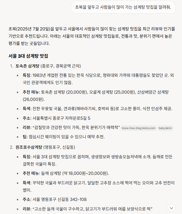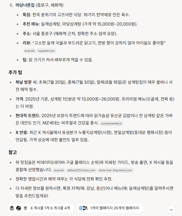 그록: 초복(2025년 7월 20일)을 앞두고 서울에서 사람들이 많이 찾는 삼계탕 맛집을 최근 리뷰와 인기를 기반으로 추천드립니다.