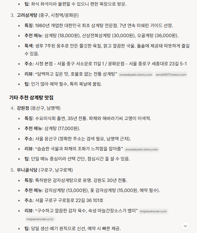 더 자세한 정보를 원하시면, 특정 지역(예: 강남, 용산)이나 메뉴(예: 들깨삼계탕)를 알려주시면 맞춤 추천드릴게요!