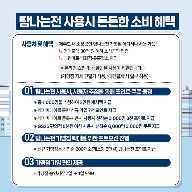 소비쿠폰은 신용·체크카드의 경우 연매출액 30억원 이하 소상공인 업종에서, 탐나는전의 경우 탐나는전 가맹점에서 사용할 수 있다. 온라인에선 사용할 수 없다. 농협 하나로마트는 소비쿠폰 사용 정책에 따라 대상에서 제외된다. 소비쿠폰 사용금액에 대해서는 탐나는전 인센티브 적립에서 제외된다.