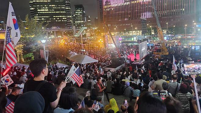 방한 중인 모스 탄 미국 리버티대 교수는 연단에 올라 "윤석열 대통령은 애초에 감옥에 계실 분이 아니다"라며 법원을 규탄했습니다.