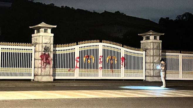 서울 종로경찰서는 어제(18일) 밤 9시 30분쯤 청와대 영빈관 앞 정문에 빨간색 래커 스프레이를 뿌린 40대 여성 A 씨를 재물손괴 혐의로 검거했다고 밝혔습니다.