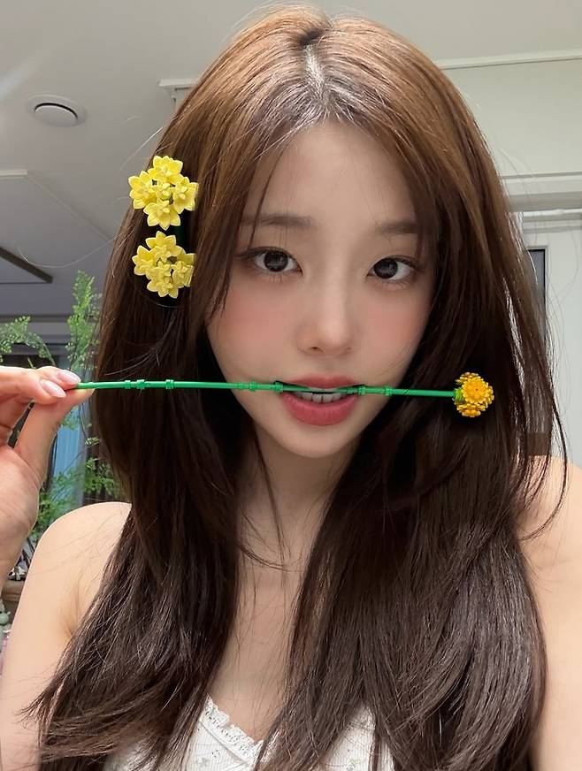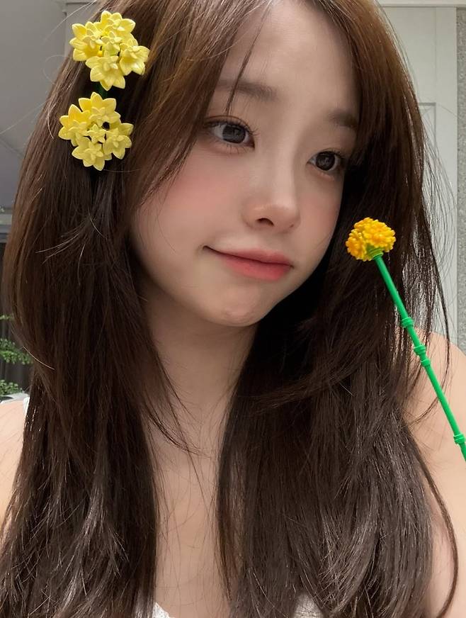 사진 속 츄는 사랑스러운 플라워 헤어 장난감으로 포인트를 준 헤어스타일을 보여준다. 브라운 컬러의 긴 머리는 자연스럽게 흘러 청순한 이미지를 더하며, 핑크 톤의 블러셔와 상큼한 립 컬러의 메이크업으로 얼굴에 생기를 불어넣었다.