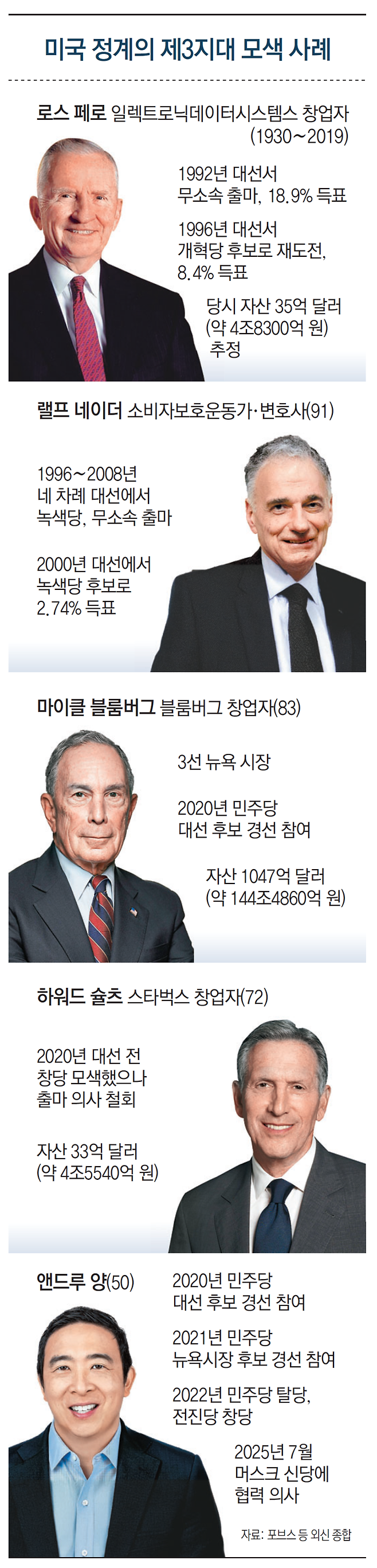 하워드 슐츠 스타벅스 창업자(72) 역시 2020년 대선을 앞두고 무소속 대선 출마 및 신당 창당 등을 모색했다가 포기했다. AFP통신 등에 따르면 그는 미국의 분열 심화, 국제사회에서 미국 내 위상 약화를 우려했다. 또 트럼프 대통령의 첫 집권 당시 수차례 트럼프 대통령을 공개적으로 강하게 비판했다. 이런 차원에서 제3당 창당을 모색했지만 현실적인 한계를 뛰어넘지 못하고 출마 전 뜻을 접었다는 것이다.