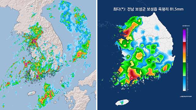 오늘(19일) 새벽 2시 38분 현재, 전남 보성군 보성읍 옥평리에 직전 1시간 동안 81.5mm의 매우 강한 비가 내렸습니다.