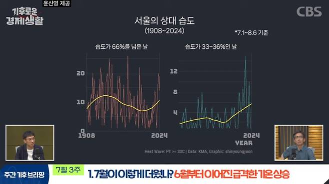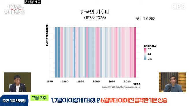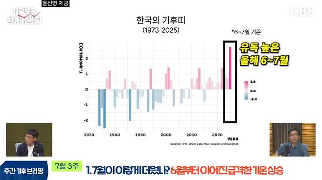 ◆ 홍종호> 기후의 눈으로 경제를 읽다. 안녕하세요, CBS 기후로운 경제생활에 오신 것을 환영합니다. 저는 진행을 맡은 홍종호입니다. 이번 여름 정말 뜨겁습니다. 말랐던 하늘은 갑자기 엄청난 양의 비를 쏟아내고요. 이런 극단성이 여름의 특징이 되어가고 있는데요. 기후위기는 대체 어디까지 왔을까요? 앞으로 한반도는 얼마나 더 뜨거워질까요? 한 장의 그래프로 오늘의 기후를 요약해 드리는 '기후 한 장'. 오늘은 여름 날씨에 관해 이야기해 보겠습니다. 윤신영 과학기자 모셨습니다. 안녕하세요.