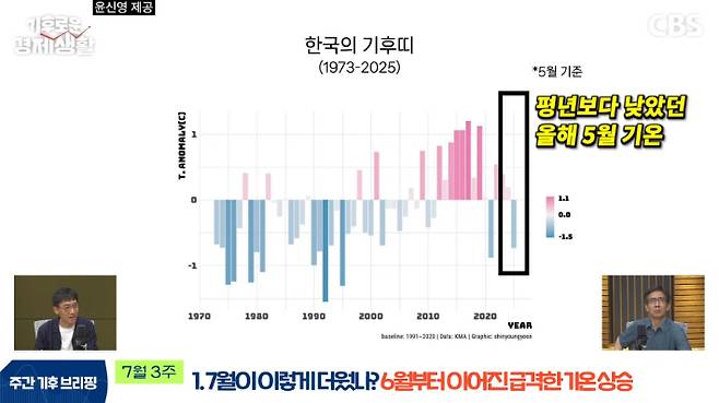 ◇ 윤신영> 조금 전에 보여드린 기후 띠 그래프를 변형하면 익숙한 막대그래프가 나오는데요. 그래프에서 월등히 치솟아 있는 막대가 지금 더운 상황이거든요. 그런데 5월 그래프를 보면 막대가 뒤집혀 있어요. 저렇게 서늘했어요. 불과 한 달 사이에 이렇게 바뀔 정도로 지금 급격하게 달궈졌다는 건데요. 제가 매년 보니까 최근 한국 여름의 특성이 그래요. 겨울이나 봄, 가을에는 그런 게 두드러지지 않는데, 여름철에는 갑자기 다른 해에 비해서 온도가 많이 올라가는 경향이 최근 많이 보입니다. 올해도 그 경향이 이어지고 있는 것 같아요.