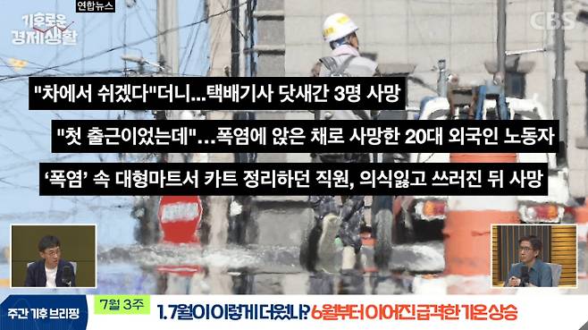 ◆ 홍종호> 중요한 지적이세요. 사실 저희 경제학계에서도 학술적으로 핫한 이슈가 폭염과 직장에서의 생산성 간 관계인데요. 노동생산성이 전반적으로 떨어지고 그 극단적인 형태가 사망으로 이어지는 것에 관한 연구들, 심지어 초중고생들의 학업 성적도 떨어지는 것에 관한 연구들이 지속적으로 나올 정도로 날씨라는 것은 일상의 삶에 아주 깊숙이 들어와 있다고 볼 수 있겠습니다. 저희가 다음 인터뷰로 행정안전부 기후재난관리과장도 모시거든요. 특히 일터에서의 건강이나 대응책을 제가 여쭤볼 생각이고요. 지금까지 이번 주 기후 한 장 첫 번째 주제, 더위에 대해서 알아봤습니다.