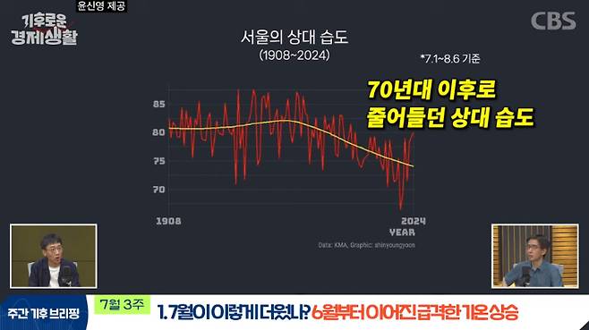 ◇ 윤신영> 맞습니다. 체감 온도라는 표현을 많이 쓰잖아요. 기상청에서 만들어 놓은 공식으로 계산할 수 있는데 굉장히 복잡해요. 그런데 체감 온도라는 게 결국은 습도를 고려한 온도예요. 습도를 고려해서 측정해 보면 훨씬 더 높게 나타나기 때문인데요. 한반도에 습한 폭염의 비중이 원래 높았지만, 최근 조금 걱정스러운 경향이 보입니다. 제가 그래프 하나를 또 준비해 봤는데요. 이건 많은 분들의 상식과 조금 다를 수 있는 부분인데, 서울의 상대 습도만을 쭉 본 거예요.