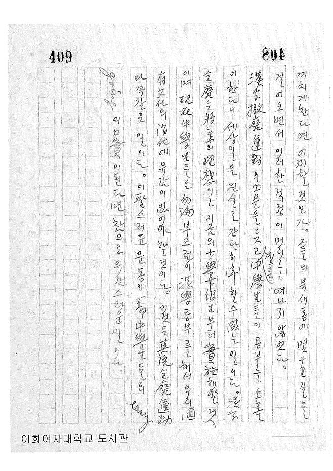한자(漢字) 철폐운동의 소문을 듣고 게으른 중학생들이 공부를 소홀히 한다니 세상일은 진실로 간단히 헤아릴 수 없는 일이다. 한자 전폐(全廢)는 장래의 이상이고 지금의 소학 하급생부터 실시해야 할 것이며 현재 중학생들은 물론 부지런히 한학 공부를 해서 우리 고유문화의 소화에 유감이 없어야 할 것이다. 이것은 영어 전폐운동과 꼭같은 일이다. [해설: 대동아전쟁 시기 일본에서 영-미 문화를 배척한 풍조를 말한다.] 이 성스러운 운동이 일부 중학생들의 나태의 구실이 된다면 참으로 유감스러운 일이다.
