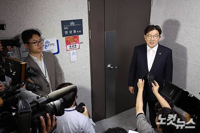 국민의힘 권성동 의원이 18일 국회 의원회관 사무실 앞에서 김건희 특검의 압수수색과 관련해 입장을 밝히고 있다. 권 의원은 "전 깨끗하고 결백하다"며 "소위 말하는 건진법사나 통일교 관계자와의 금품수수 사실에 대해 전혀 아는 바가 없고 관여하거나 개입한 바가 없다"고 말했다. 윤창원 기자