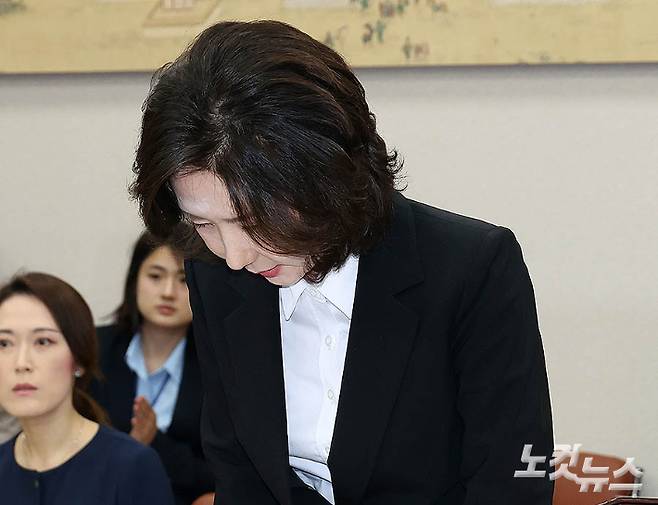 자녀 불법유학과 논문 표절 논란에 휩싸인 이진숙 교육부장관 후보자가 16일 인사청문회에 출석해 더불어민주당의 사과 요구에 일어서 허리 숙여 사과했다. 자녀 불법유학에 대해선 사과했지만, 논문 표절 논란에 대해선 이공계와 인문계 논문의 기준이 다르고 이공계에선 문제가 없는 일이라고 적극 해명했다. 윤창원 기자