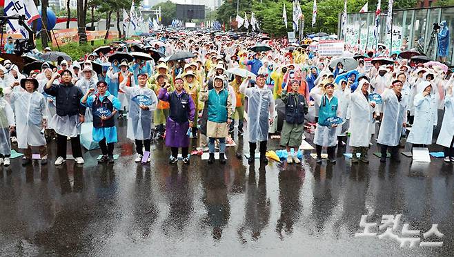전국민주노동조합총연맹이 16일 오후 서울 여의도 국회의사당 앞에서 2025 총파업 대회를 열고 노동조합법 2·3조(노란봉투법) 즉각 개정, 윤석열 정부 반 노동정책 폐기 등을 촉구하고 있다. 류영주 기자